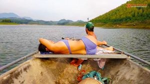 Afterward, you can take on the challenge of riding on different terrains and immerse yourself in the greenery of tea fields and palm trees. Leaving the wild landscape behind and heading to Thac Ba lake, Vu Linh Commune, you will be greeted by a peaceful village near Thac Ba Lake’s bank.