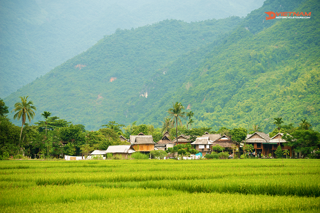 The ideal place we started the journey would be in Ha Noi - the capital of Viet Nam. From there, we went the west to Mai Chau valley by motorbike and enjoyed the beautiful landscapes of the mountains, and fields, as well as houses on stilts gathered around the foot of the mountain.